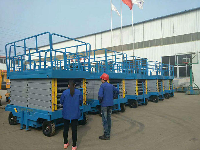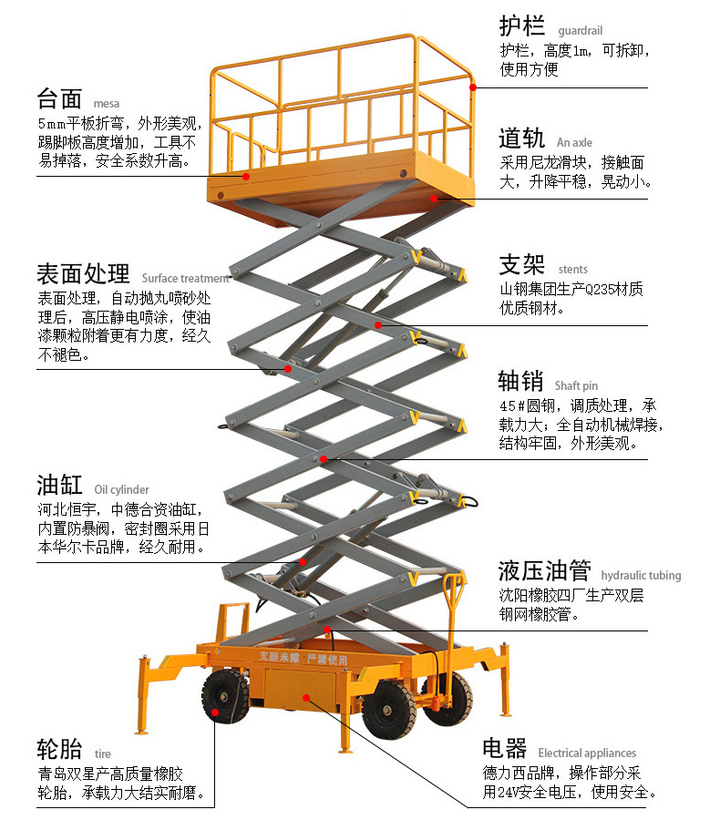 移動(dòng)剪叉升降機(jī)是用途廣泛的高空作業(yè)專(zhuān)用設(shè)備。它的剪叉機(jī)械結(jié)構(gòu),使升降臺(tái)起升有較高的穩(wěn)定性,寬大的作業(yè)平臺(tái)和較高的承載能力,使高空作業(yè)范圍更大、并適合多人同時(shí)作業(yè)。升降動(dòng)力分為220V或380V電源,柴油機(jī),或電瓶動(dòng)力源,特殊環(huán)境也可采用防爆泵站及防爆電器。升高4—22米,載重0.3—3噸。采用意大利和國(guó)產(chǎn)液壓泵站,臺(tái)面使用防滑絕緣扣板,具有防滑,絕緣、安全,請(qǐng)放心使用。它使高空作業(yè)效率更高,安全更保障。 |